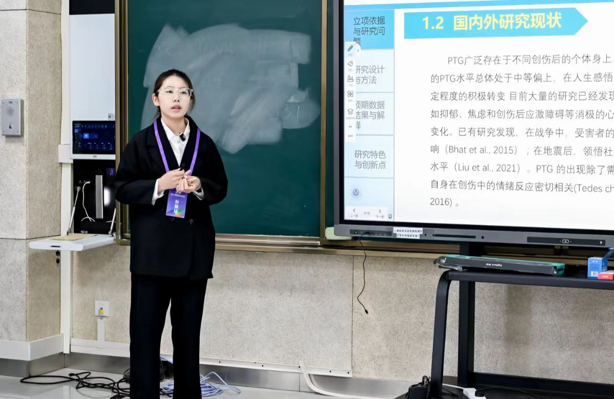 23-1班蒋灿同学负责的心理学实验设计作品《家庭读写环境对3~7岁人工耳蜗听障儿童口语流畅性的预测作用以及追踪研究》入围现场决赛环节,现场抽取新命题后给定的时间内完成《优秀大学生群体中童年创伤与心理韧性的关系:基于归因风格的中介调节模型》实验设计,斩获二等奖。