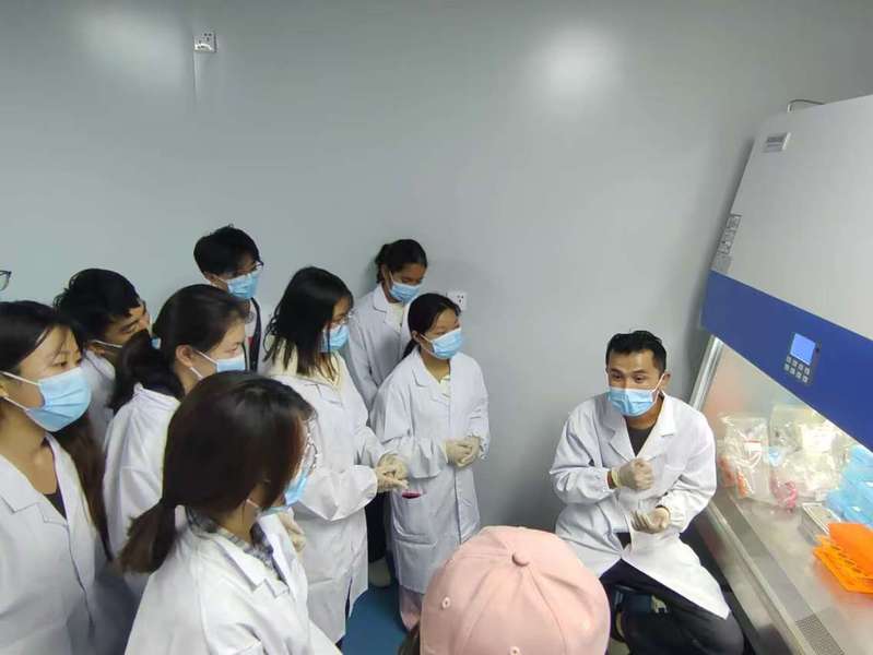图8 安外尔•热合曼博士向学生介绍神经细胞培养技术