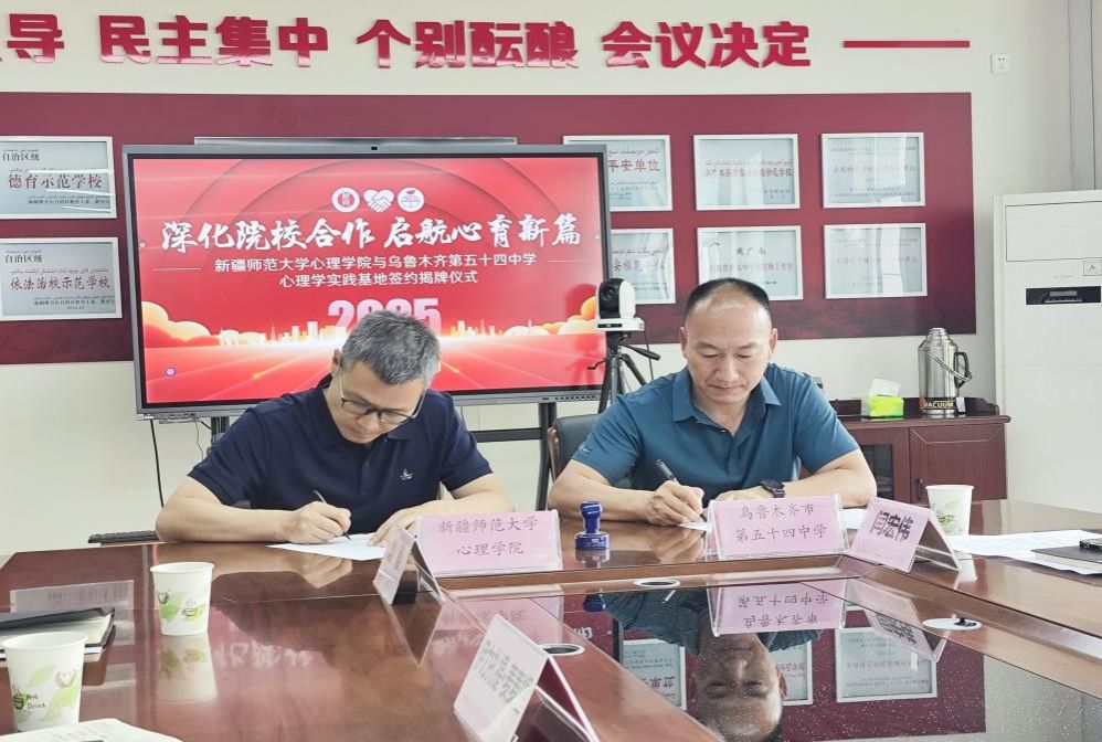 2025年6月11日上午12时30分,我院与乌鲁木齐市第五十四中学教育实践基地签约揭牌仪式在五十四中学三楼会议室举行。学院副院长刘毅(主持工作)、分管教学工作的副院长伊力扎提·麦麦提、应用心理学系副主任郭薇,乌鲁木齐市第五十四中学校长闫宏伟、副书记林燕、副校长张萍和学校心理健康教育教师徐翠霞参加本次活动。