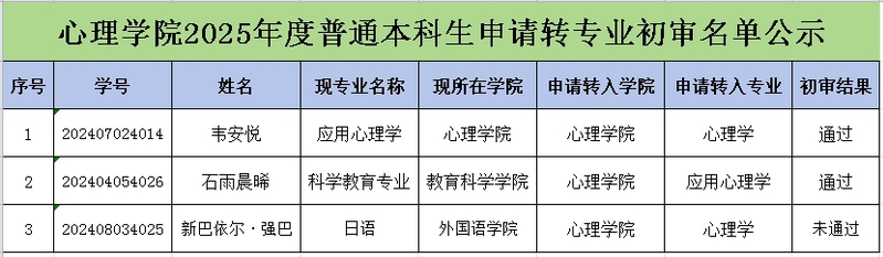按照《关于做好2025年普通本科生转专业工作的通知》的要求,经学生本人申请,学院初审,现将初审名单予以公示,公示期为2025年3月5日—3月7日,如有异议,请在公示期内与马老师联系,电话:0991-4110506。(名单见附件)